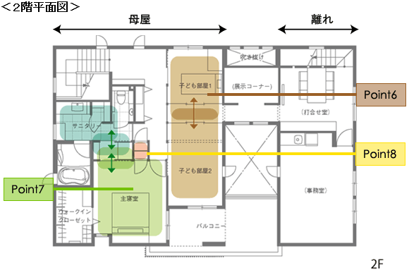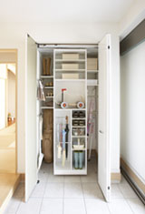 1階の趣味室と、2階の主寢室には、表裏両側から使用できる物入れがあります。 2階の物入れの場合、主寢室側?廊下側から自由に出し入れできる場所に配しています。 例えば、主寢室側からは生活雑貨やアクセサリー、化粧品等の小物置き場として、廊下側からは頻繁に著る上著やコートなどのコンパクトなクローゼットとして使う等、用途と動線に適った快適な使い方が可能です。