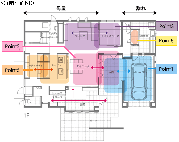 ダイニングルーム+中庭、リビングルーム+タタミスペースそれぞれが一體化し、大人數のホームパーティーにも対応できる大空間となります。 さらに、キッチンやガレージまでスペースを最大限オープンに使い、開放感あふれる演出も可能です。 限られた敷地でも、空間の使い方次第でいかようにも暮らしの楽しみ方の広がりを実感していただける提案です。