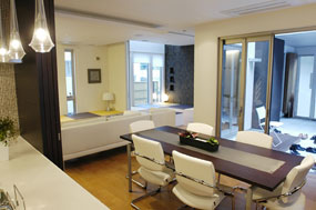 リビングルームと、隣接するタタミスペースは、ボックス型の置き畳や家具をフレキシブルに移動させることにより二部屋が一體化した空間になります。 また、タタミスペースにはスライド扉を設けており、お客様が宿泊される際などはプライバシーを保つ"獨立した和室"としても使うことができます。