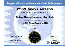 大和ハウス工業株式會社(本社:大阪市、社長:村上健治)が、毎年発行している年次報告書「アニュアルレポート2006」(英語版)が、LACP(※)主催のアニュアルレポートコンテスト ?2006ビジョン?アワード?の総合(トップ100団體)で2,500団體以上の中から世界第9位と上位入賞を果たし、昨年度の29位から大きく躍進しました。