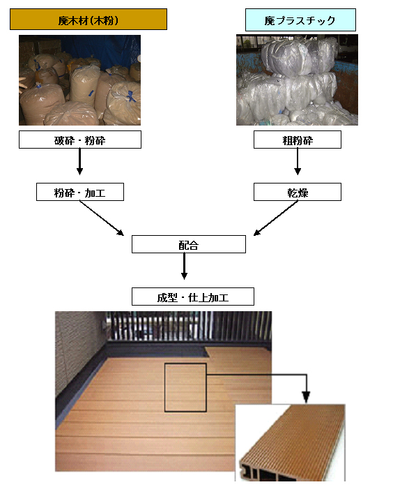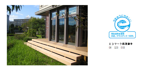 「木粉リサイクルデッキ」は、当社独自のリサイクルシステム“工場デポ(※5)”によって、工場に集約された廃木材を、樹脂(廃プラスチック)などと混合・成型した人工木材です。 本製品は、重量の90%以上が再生材料で構成されており、天然資源の保護および廃棄物発生量削減の両面で環境保全に有用であることが評価され、2006年9月、財団法人日本環境協会からエコマーク(※6)の認定を受けました。 現在、当社の屋外用ウッドデッキとして商品化しています。