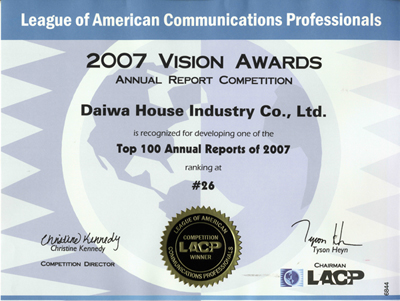 大和ハウス工業(yè)株式會(huì)社(本社:大阪市、社長(zhǎng):村上健治)が、毎年発行している年次報(bào)告書「アニュアルレポート2007」(英語(yǔ)版)が、LACP※主催のアニュアルレポートコンテスト ?2007ビジョン?アワード?の“不動(dòng)産?REIT”部門で4年連続世界第1位となりました。また、“インハウス(社內(nèi)制作チーム)部門”では世界第2位、総合でも3,000団體以上の中から世界第26位にランキングされました。同コンテストで日本企業(yè)が部門別で4年続けて1位を獲得するのは初めてとなります(過(guò)去、部門別で1位を獲得した日本企業(yè)は當(dāng)社のみです)。