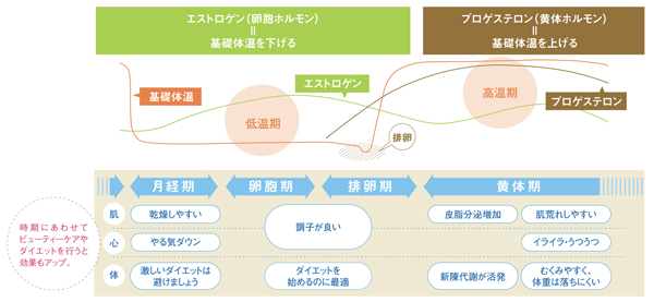 ●女性の基礎體溫と2つの女性ホルモンの関係図