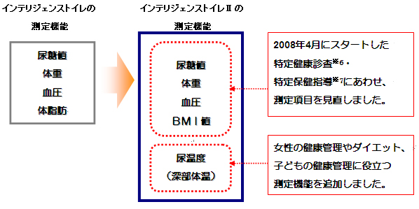 新たに発売する 『インテリジェンストイレⅡ』は、従來の「尿糖値」「血圧」「體重」の機能に加え、「尿溫度(深部體溫(※1))」を測定することができ、さらに従來機種の「體脂肪」に変わる新たな機能として、「BMI値(※2)」の表示機能を搭載しました。「尿溫度(深部體溫)」測定は、習慣化することにより、女性特有のホルモンバランスを知ることができるため、女性の月経の時期や排卵日を予測することができます。「BMI値」測定は、子どもから大人まで、肥満やメタボリックシンドローム(※3)の予防、健康管理にも役立たせることができます。