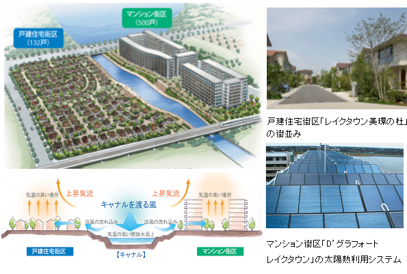 当社は2008年3月にまちびらきした「越谷レイクタウン」(埼玉県越谷市)内に戸建住宅132戸と分譲マンション500戸の一体開発を行っています。当街区は、当社が進める「自然と調和した街づくり」の先進モデルの一つであり、風・太陽・水といった自然を最大限活かす工夫により、環境省のモデル事業「街区まるごとCO2 20%削減事業」の第一号※3として採択されました。戸建住宅街区では、地域の風と水に着目。最新の風況シミュレーション技術により、街区全体の風況解析を行い、その結果をもとに個々の住戸にパッシブデザイン※4を採用。風環境の良い場所にリビング、ダイニングを配置し、住戸内に風を取り込み、通風や排熱を促進させる工夫を凝らしました。 一方、マンション街区では、日照条件の良さに注目。マンションの各住戸への給湯・暖房用に、集合住宅としては日本最大規模の太陽熱利用システムを導入しました。 ※3. 分譲マンション「D’グラフォートレイクタウン」は平成18年度「街区まるごとCO220%削減事業」の第一号に採択されました。また、戸建住宅「レイクタウン美環の杜(みわのもり)」についても戸建住宅街区として初めて、平成20年度「街区まるごとCO220%削減事業」に採択されました。 ※4. 自然エネルギーを最大限利用した建築デザインのこと。
