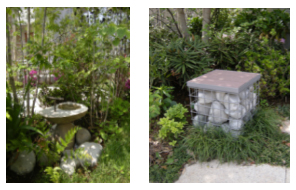 野鳥たちのリラクゼーションスペースとなるバードバス(左)と石のすき間に小動物が集う花置臺(右) |