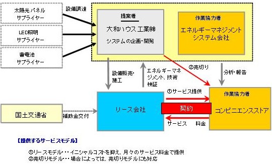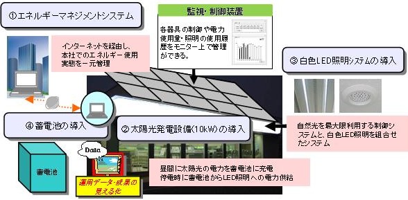 2.採択された事業内容 (1)「コンビニエンスストア向け次世代省CO2モデル事業」の概要 ①導入機器と「エネルギーマネジメントシステム」 今回「コンビニエンスストア向け次世代省CO2モデル事業」で導入する機器は、太陽光発電システム(約10kW)、当社オリジナルの商業施設向け白色LED照明システム「グレースルミノ」、蓄電池(リチウムイオン電池または鉛電池)です。省エネルギー・省CO2を推進できる機器をサービスとして提供するモデルを構築します。 また、それぞれの機器で発生したエネルギーを一括管理できる「エネルギーマネジメントシステム」でエネルギーの見える化を図ります。コンビニエンスストア内の電力データを収集し、データ分析を行うことで省エネルギー・省CO2を実施するための改善を提案します。 今回の提案モデルでは、コンビニエンスストアの店舗で使用するエネルギー量を集積して一括管理することによって、さらに大きな効果を得ることが可能となります。 ②実施内容