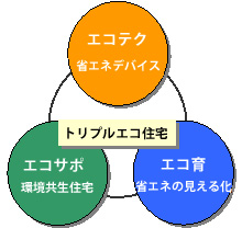 今回当社がCO2排出量を削減するために提案するものは「トリプルエコ住宅」です。当社の戸建住宅商品「xevo(ジーヴォ)」に、「エコテク(省エネデバイス(※6))」・「エコサポ(環境共生住宅)」・「エコ育(省エネルギーの見える化)」の3つの特長を追加した住宅です。 ※4.新エネルギー基準を強化改正し、エネルギー消費量の20%削減を目指して1999年3月に制定された基準。 ※5.人と住まいをとりまく環境をより良いものにしていくために、「地球環境を保全する」「周辺環境に親しむ」「健康で快適な居住環境」という3つの考え方に基づいた住まい作りのことで、財団法人建築環境・省エネルギー機構が認定するもの。当社の建設実績は、売上実績を基準として集計しています。 ※6.省エネに関する周辺機器のこと。 |