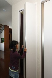 小さな子どもの場合、指が細く柔らかいため、万が一、折戸に指が挟まれた場合、骨折など大きな事故にもつながります。そこで、当社では、昨年キッズデザイン賞会長特別賞を受賞した『フィンガーセーフドア』に引き続き、『フィンガーセーフ折戸』を開発。折戸の蝶番部分にカバーを設け、あらかじめ隙間をふさぐことで指を挟む危険性をなくしました。 |