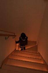 ■イルミステップ 小さな子どもは壁面付近を歩くことが多いというデータ(※2)に基づき、階段幅いっぱいに照らす「イルミステップ」を今回新たに開発しました。階段の蹴込み部分に設けた光源が各段をやさしく照らすことで、足元照明として暗がりの危険から家族を守ります。
