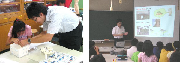 ●コミュニケーションデザイン部門 (1)『D’sスクール』 『D’sスクール』とは、当社社員が小・中学校を訪問し、「住環境」や「環境」に関する出張授業を行っているものです。子どもたちの興味・関心を引き出し、先生の授業づくりを支援することを目的としています。 当社では、2002年度より東京・大阪地区の小・中学校において、「住環境」をテーマに「快適な住まい(住まいの風通し、明るさ、涼しさ、暖かさなど)」について教える出張授業を行っています。 授業では、子どもに住宅模型や断熱材などに触れてもらい、専門知識を持つ当社社員が住まいや環境に関する講義を行うなど、「生きた知識」を提供しています。 また、住宅ペーパークラフトや副読本などの簡単でわかりやすい教材を使用することにより、子どもたちは楽しみながら知識を身に付けることができます。