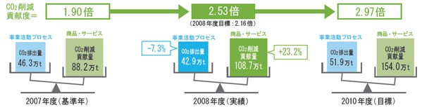 ※1.「商品・サービスによるCO2削減貢献量」を「事業活動プロセスにおけるCO2排出量」の2倍以上にすることで、事業を通じてCO2排出量の削減に大きく貢献することを目指すもの。