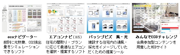 2.4つの「エコの見える化ツール」で、エコを身近にわかりやすく伝えます 当社独自の「省エネルギーの見える化」の仕掛けである3つの見える化ツール「ecoナビゲーター」「エアコンナビ」「パッシブビズ風・光」を、新築住宅をプランニングする際、お客さまに提案します。さらに入居後は「みんなでECOチャレンジ」によってお客さまの省エネ生活をサポートします。その結果、「xevo」が持つ省エネルギー性能の高さと効果を理解していただくことができます。当該ツールでは、家の中における風の流れや光の差し方、将来ご家庭で発生する光熱費、CO2排出量、エネルギー使用量なども予測することができます。