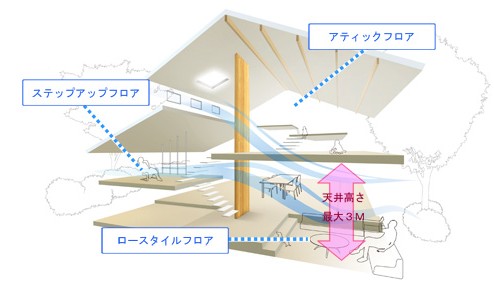 2. KU-LAY(クーレイ)システム 「xevoKU~空~」では、「遮熱外張り屋根断熱工法」によって住まいの空間が大幅に広がりました。 この広がった空間を有効に活かすため、当社独自のフロアレイアウトシステム「KU-LAY(クーレイ)システム」を開発しました。「アティックフロア」「ステップアップフロア」「ロースタイルフロア」の3つのフロアスタイルを自在に組み合わせることで、家族団欒のスペースや収納スペース、子どもの遊び場など、空間のひろがりとともに家族のつながりも深めることができます。 |