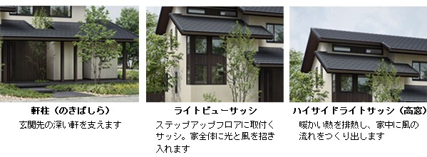 3.日本の風景と響き合う外観シルエット 「xevoKU~空~」は、日本の住宅が持つ深い軒の美しさが外観の特長です。3つのフロアスタイルが外観にあらわれ、屋根の重なりの美しさを表現しました。 日本の風土や家並みへの調和を考え、外装部材に木調素材を採用するなど、和を感じさせる住まいです。