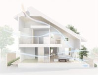 この風の道は、通常の窓だけでなく、天窓や吹き抜けの配置を工夫し、タテとヨコへの「風の流れ」を創り出します。そうすることで、新鮮な空気を空間のすみずみまで届けることができます。エアコンなどの空調機になるべく頼らない工夫を盛り込むことで、エコな暮らしを実現することができます。 |