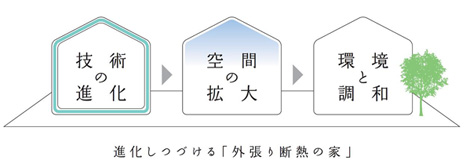 ■商品コンセプト 「xevoKU~空~」は、耐久性と省エネルギー性に優れた当社独自のオリジナル外壁システム「外張り断熱通気外壁」の技術を屋根まで拡げ、新たに「遮熱外張り屋根断熱工法」を開発しました。これにより、住まいのスペースを屋根裏にまで広げることができました。 「xevoKU~空~」は、自然力を上手に住まいに取り入れるだけでなく、技術の進化によって空間を広げることができた環境配慮型住宅です。