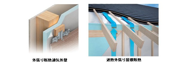 ■商品特長 1.新たな「遮熱外張り屋根断熱工法」「高耐力屋根構面」を開発しました 「xevoKU~空~」では、新たに開発した「遮熱外張り屋根断熱工法」を採用しました。「遮熱外張り屋根断熱工法」は、「xevo」で培った「外張り断熱通気外壁」の技術を屋根面にまで拡げた工法です。断熱材を構造材の外側に配置し、屋根材の下に「通気層」を設け、その内側に遮熱機能のある「反射材」を採用することで、太陽の日射熱の「伝導」と放射による「熱吸収」を抑えました。外気温が30℃、屋根表面が65℃の状況下でも、屋根裏の室内温度は28℃程度のため、屋根裏空間でも快適に過ごすことができます。 また、「遮熱外張り屋根断熱工法」を最大限に活かすため、新たに「高耐力屋根構面」(※6)を開発。大きな屋根裏空間を実現することができました。 この「高耐力屋根構面」(※6)は、地震力や風圧力に対して高い剛性を発揮し、加えて、大屋根や大きな吹き抜けの勾配天井などの提案が可能になります。 ※6.高耐力屋根構面は構造計算により分析されたデータを基に必要に応じて屋根部分に配置します。