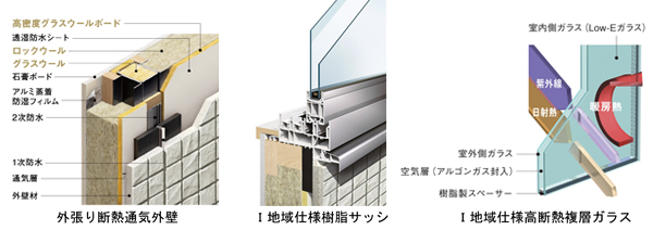 1.オリジナル外壁システム「外張り断熱通気外壁」を標準採用 当社の戸建住宅主力商品「xevo」では、オリジナル外壁システム「外張り断熱通気外壁」を標準仕様としたことで、ワンランク上の省エネ高耐久性能を実現し、好評をいただいています。 そしてこのたび、「セジュールウィット北海道仕様」に「外張り断熱通気外壁」を標準採用し、建物の耐久性と断熱性を向上させ、ご入居者の快適性を高めました。 また、断熱性能を大きく左右する開口部には、樹脂サッシを採用。さらに、高断熱(Low-E)複層ガラスにはアルゴンガスを封入し、断熱性能を向上させるとともに結露の発生を抑える対策を施しました。