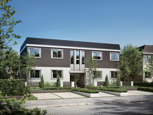 (1)外観 街並みに調和し、市場ニーズが高く、時代に流されない多様なモダンデザインを採用しました。また、正面に特長的なエントランスサッシを用いることにより、外観をよりモダンなデザインにしています。