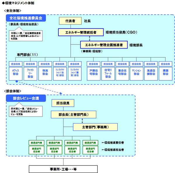 ※1.Chief Green Officer の略で、経営の視点から事業全体を俯瞰して、省エネルギー活動・環境管理を統括する責任者(役員等)のこと。 ※2.大和ハウスグループ全体では72社。(当社含む 平成22年1月27日現在) |