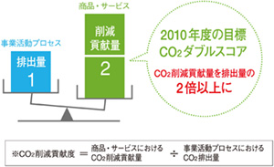 2.グループ全体で共有する指標として独自の「CO2削減貢献度」を導入 当社グループでは、環境ビジョンである「環境と共生し人が心豊かに生きる社会」の実現に向け、中長期的な環境戦略を立て、その具体的な計画を『Endless Green Program(エンドレスグリーンプログラム)』として3ヵ年毎に策定しています。2008年度から2010年度における中期環境行動計画「エンドレスグリーン プログラム 2010」では、「地球温暖化防止」を最重要テーマに、「私たちの事業で地球にかけた負担(CO2排出)以上に地球に貢献(CO2削減)しよう」という考えから、当社グループの事業活動によって地球温暖化防止に貢献できた度合いを測る指標として、『CO2削減貢献度』を導入。2010年度の目標を2倍以上(CO2ダブルスコア)に設定しました。 この目標達成に向け、当社グループのオフィス・工場・ホテル等での省エネ対策によりCO2排出量を削減するとともに、住宅や建築物における省エネ対策を積極的にお客さまへ提案、全事業領域で取り組みを推進しています。