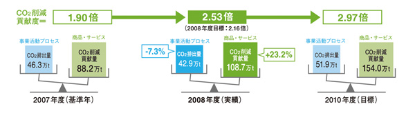 3.2008年度において「CO2ダブルスコア」を達成 2008年度は、事業活動プロセスにおけるCO2排出量は前年度比7.3%減の42.9万t-CO2、環境配慮型の商品・サービスを提供することによるCO2削減貢献量は同23.2%増の108.7万t-CO2となりました。これにより、CO2排出量に対するCO2削減貢献量(=CO2削減貢献度)は2.53倍となり、2008年度の目標を達成しました。 これは、事務所やホームセンターでのエネルギーの「見える化」による運用改善の徹底、ホテル・工場での熱源改修工事など、全部門においてソフト・ハードの両面からCO2排出量の削減に取り組むとともに、断熱性能の高い戸建住宅商品「xevo(ジーヴォ)」や太陽光発電システムの普及、リフォーム事業での断熱改修や高効率給湯器の設置提案、環境エネルギー事業における高効率照明器具の設置提案など、全事業領域において環境配慮型商品・サービスの提供を進めた結果です。 2008年度の実績を受け、2010年度のCO2削減貢献度については目標を2.97倍へと上方修正し、エネルギー管理体制の強化、賃貸住宅での環境対応商品の開発、環境エネルギー事業の拡大など、さらなる取り組みを進めています。