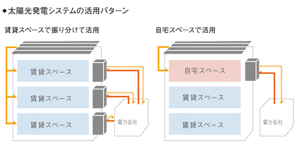 太陽光発電システムで発電した電力は、賃貸スペースの各ご入居者の自宅電力として振り分けたり、土地オーナー様の自宅電力として活用することができます。余剰電力は売電し、ご入居者へ還元することで、賃貸住宅に付加価値を与え、長期にわたる安定経営につながります。