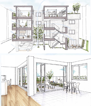 「アバンウェル ディッツォ」は、「DSQフレームシステム」により、4層を通した吹抜けを配置することができ、建物の中心に吹抜けを設けることによって、自然の風を取り込むプランの提案ができます。 各世帯が吹抜けを囲むことで、賃貸スペースはプライバシーを高めるとともに、土地オーナー様の自宅スペースとしては家族の存在を感じさせる空間を提案します。 また、屋上やバルコニーを利用して、家庭菜園やガーデニングを楽しむことのできる、都市部においても自然に囲まれた暮らしを提案します。 |