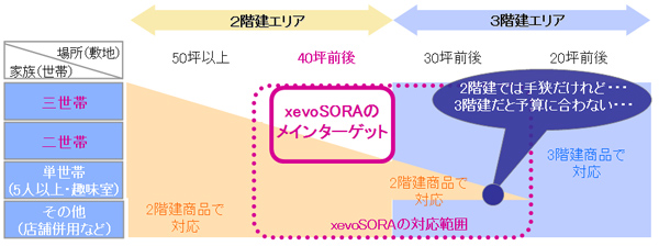 そしてこのたび、30代建て替え層をターゲットに據(jù)え、コストパフォーマンスに優(yōu)れた3階建小屋裏利用木造戸建住宅「xevo SORA」を発売します。