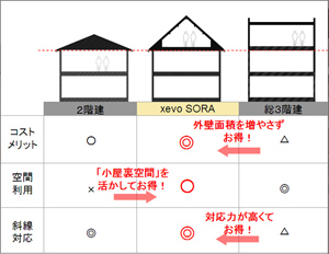 「xevo SORA」は、小屋裏空間を利用することで、3階建でありながら外壁面積の増加を最小限に抑えることができ、当社の2階建自由設計商品「xevo WW(ジーヴォ・ダブリューダブリュー)」と同程度の価格で提供できます。また、同条件の2階建と比較して、室内空間を1.25倍確保することができます。 |