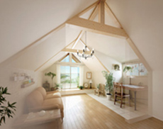 「xevo SORA」で提案する3階「ゆとりの間」は、従来の狭くて暗いイメージを持つ小屋裏スペースを最大限活用することで、居室としての十分な空間を確保することができました。開口部を大きく設けることで、ゆとりある快適な居住空間を実現しました。 寝室の他に「ラウンジ」「ライブラリー」「ホビールーム」など、子どもでも大人でも使えるスペースとなります。 |