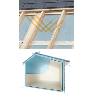 「チアベントシステム」は、当社が独自に新開発した「遮熱屋根断熱通気工法」です。 屋外温度の影響を受けやすい小屋裏スペース(3階部分)について、2階の居住スペースと同等の室内環境を実現しました。 日射熱による温度上昇を防ぐために、屋根内部に表面をアルミ遮熱材で被覆した断熱材を充填。また、屋根材と遮熱材の間に設けた通気層が、熱を棟部から外へ排出します。この「断熱」「遮熱」「排熱」の3つの機能が、外気温の影響を受けにくくし、室内の温度を一定に保つことを可能としました。 |