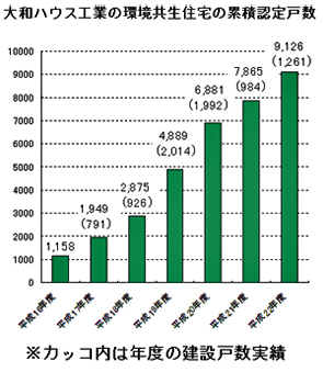 当社では、「環境共生住宅」を低炭素社会とサスティナブル社会を先導する住宅として位置づけ、自然環境との共創共生を図る「自然と調和した街づくり」を進めるなかで、その進捗を測る指標として積極的に活用してきました。 昨年度は、国土交通省が実施した「平成21年度(第1回)住宅・建築物省CO2推進モデル事業」に応募し採択された全国5ヶ所の分譲地が、環境共生住宅認定を要件とする運用としたため、実績を押し上げました。これらの取り組みにより、当社は建設実績総合1位を達成することができました。 ※環境共生住宅:人と住まいをとりまく[環境]をより良いものにしていくために、「地球環境を保全する」「周辺環境に親しむ」「健康で快適な居住環境」という3つの考え方に基づいた住まい作りのことで、財団法人建築環境・省エネルギー機構が認定するもの。 ※当社の建設実績は、売上実績を基準として集計しています。