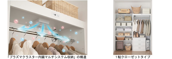 ●子ども視点の安全安心デザイン 一般部門 プラズマクラスター技術搭載マルチシステム収納 「プラズマクラスター技術搭載マルチシステム収納」は、衣服などを納めるクローゼット上部(枕棚下部)にプラズマクラスターイオン発生モジュールを組込み、イオン濃度25,000個/cm3の高濃度イオンを衣類等に集中的に当てることで、繊維に染み付いたタバコ臭や汗臭などの付着臭を分解・除去するものです。 本収納を搭載することで、ハウスダスト中のダニのふん・死がいの浮遊アレル物質の作用を抑えることができます。(※2)