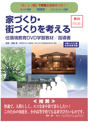 ●『住環境教育DVD学習教材「家づくり・街づくりを考える」の制作・配布』 本教材は、小学校高学年から高等学校までの生徒に、家づくり・街づくりをはじめ、地球環境や社会、地域などについて興味・関心を持ってもらえるよう制作しました。 生徒が住宅展示場や総合技術研究所、工事現場を訪問するシーンを、3つの章(家ってなんだろう?・地球にやさしい家って?・みんながイキイキ暮らせる街って?)で構成するDVD映像(約30分)にまとめました。 また、先生が生徒に映像を見せながら授業を進行できるよう、12パターンの指導案と解説資料を1冊のテキストにまとめています。 本教材の普及により、持続可能で安全・安心な家づくりや街づくりを担う次世代を育成し、地域社会における多様なネットワークづくりを構築していきたいと考えます。 本教材は、無料(送料のみ着払い)でご希望者に随時送付いたします。 ●申込先:大和ハウス工業株式会社CSR推進部 csr@daiwahouse.jp