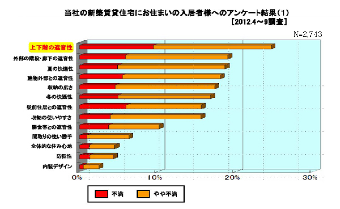 ■開発背景 「警視庁の統計(平成23年)」の環境関係苦情等の受理狀況(第75表)によると、一般家庭?アパート?マンション等の苦情(110番通報)のうち約半數(16,426件中8,579件)が「人聲音」でした。また、當社が行った賃貸住宅入居者へのアンケートでも、不満項目の中で、音に関するものは多く、上下階の遮音性に対する不満度は最も高くなっています。 そこで、新たに開発した軽量鉄骨造の軀體と高強度プレキャストコンクリートの床版を組み合わせ、上下階の遮音性能を大幅に向上させた高遮音床「サイレントハイブリッドスラブ50」を開発しました。