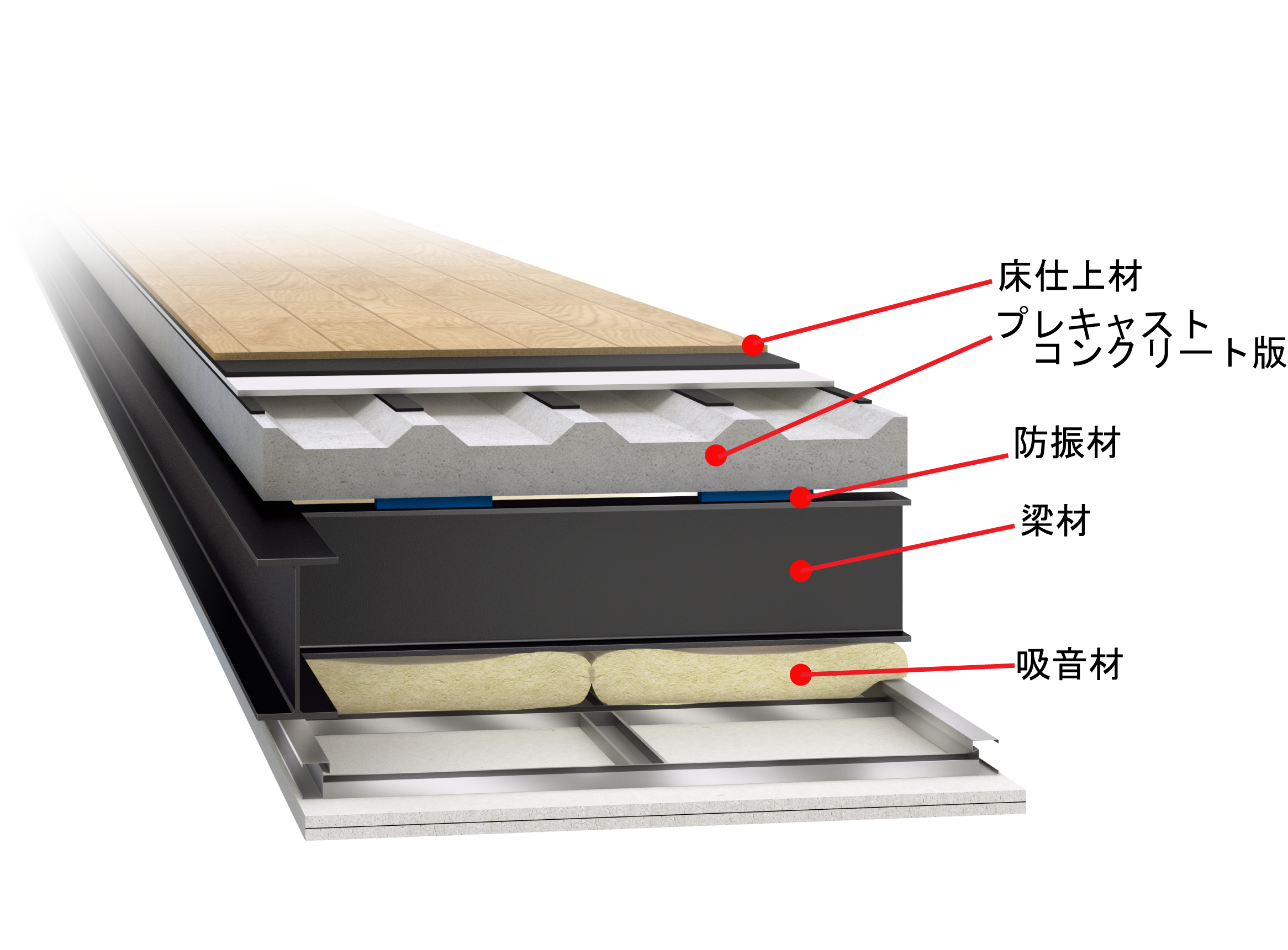 ■仕様特長 「サイレントハイブリッドスラブ50」は、高層ビルで使用されている高強度のプレキャストコンクリート版を低層賃貸住宅向けに採用したものです。プレキャストコンクリート版は突起を設けた「リブ付斷面」とし、床衝撃音を低減するとともに、上階との遮音性能も向上させました。(※6) また、梁の上部には、オフィスビルなどの制振裝置にも使用される粘弾性體の防振材を採用することにより、軀體(柱?梁)に伝わる振動も低減しました。 「サイレントハイブリッドスラブ50」の性能値「LH-50」は、鉄筋コンクリート造のマンションのコンクリートスラブで、270mmもの厚さに相當し、當社従來の仕様と比較しても、聞こえる音は3分の1程度になります。 ※6.株式會社エム?テックと共同開発(特許出願中) |