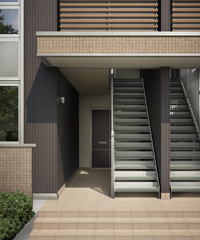 ■商品特長 1.各入居者専用の「プライベートアプローチ」 「セジュールウィット-KJ」「セジュールオッツ-KJ」は、1階の住戸と獨立して、2階の入居者専用の屋外階段を設置しました。従來の重層長屋タイプで屋內に設置していた階段を屋外に設けることで、屋內階段の昇り降りで発生していた振動音を抑制するとともに、入居者の動線を分離し、プライバシーも確保できる「プライベートアプローチ」を採用しました。 |