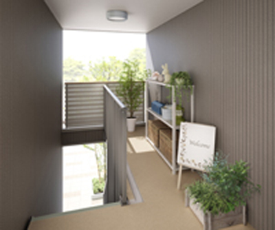 2.各住戸専用の外部スペース「エクストレージ」 「セジュールウィット-KJ」「セジュールオッツ-KJ」は、各住戸専用の外部スペース「エクストレージ」を採用しました。 1階の入居者、2階の入居者それぞれの玄関付近に、住戸専用の外部スペースを設けたことで、アプローチを彩る?ベビーカーや遊び道具を仮置きするといった利用ができ、入居者の暮らしの自由度も向上します。 |