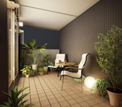 3.居室と一體となった半屋內空間 「エコロジアバルコニー」(3階建のみ) 「セジュールオッツ-KJ」は、1階部分と2、3階部分で住居を分けており、2、3階はメゾネット住戸としています。3階部分では、半屋內空間「エコロジアバルコニー」を採用しました。 居室と一體利用できるようなプランニングも可能で、入居者への生活提案に幅が広がります。 また、軒が深く半屋內となっているので、急に雨が降った場合でも洗濯物が濡れる可能性も軽減されます。 |