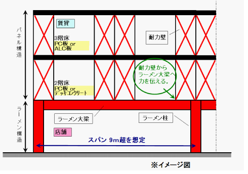 ■商品特長 1.重量鉄骨ラーメン構造?軽量鉄骨パネル構造併用のハイブリッド構造を採用 1階部分にテナントを誘致し、土地オーナー様の収益性を確保 1階部分は、最大で9m超の大開口部を設けることができるため、コンビニエンスストアやオープンカフェなど、開放的な空間を必要とする店舗に対応できます。 また、スペースを小分けすることで、弁當屋やマッサージ店なども展開でき、30~200㎡程度の小規模店舗に対応します。 あわせて、當社およびグループ會社の事務所も展開する予定としています。 |
