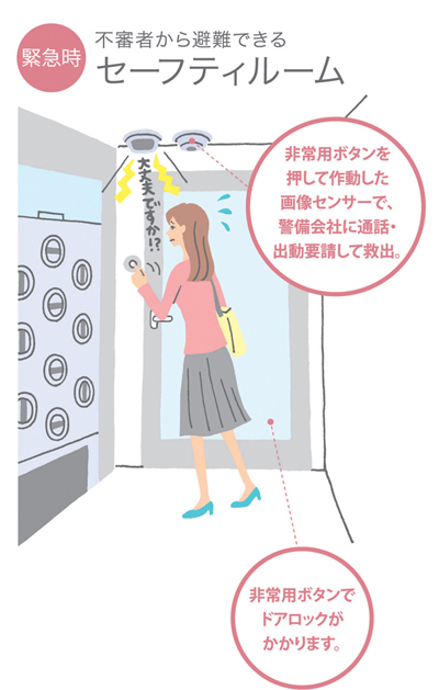 2. 緊急時は警備対応機能のついたセーフティルーム 不審者などから身を守らなければならない緊急時には、セーフティルームとして機能します。 入り口橫にある非常用ボタンを押すと、電気錠が作動して、ドアにロックがかかります。同時に警備會社へ連絡が入り、警備員が現地へ急行します。 天井には畫像センサーが設置されており、警備會社は、室內の様子を畫像で確認しながら通報者と通話をすることができます。リアルタイムに狀況把握ができるので、警備員が到著するまでの間も通報者の不安を和らげることができます。 また、入り口ドアには防犯合わせ強化ガラスを採用し、不審者の強硬な侵入を防ぎます。