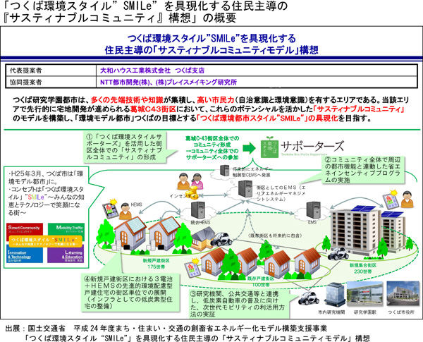 (※3) 環境モデル都市?つくばが提案した「つくば環境スタイル“SMILe”」を具現化する取組として,國土交通省「平成24年度まち?住まい?交通の創蓄省エネルギー化モデル構築支援事業」のもと, 申請企業である大和ハウスと,協同提案企業であるNTT 都市開発,㈱プレイスメイキング研究所がつくば市の支援を受け策定した構想 |