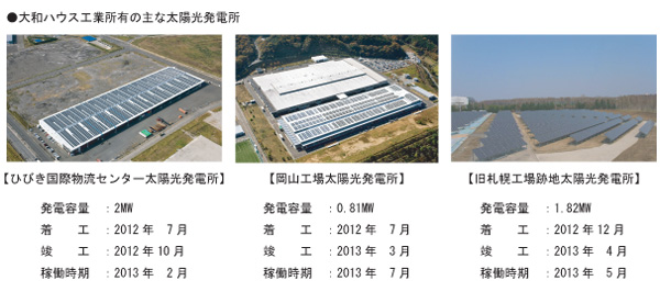 現在、國內では低炭素社會の実現に向けて、太陽光発電所の建設が活発化しています。2012年度までに、大和ハウスグループ全體で約42.9MWの太陽光発電所(産業用)を受注してきました。また自社施設として、ひびき國際物流センター太陽光発電所や舊札幌工場太陽光発電所などのメガソーラーを運営しています。 今後も大和ハウスグループでは、「風」「太陽」「水」の再生エネルギー資源の有効活用をテーマに自社未利用地の活用をはじめ、自治體や各企業が保有する未利用地なども活用した再生可能エネルギー事業について、創業以來培ってきた技術力を活かし、2015年度までに計100MWの再生可能エネルギーによる発電事業に取り組みます。 |