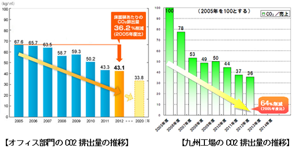 1.「環境負荷ゼロ」の商品展開に向け、多様な自社施設で「Smart-Eco Project(スマートエコプロジェクト)」を推進 當社では、2020年までに住宅や建築物のライフサイクルにおける「環境負荷ゼロ」に挑戦する「環境中長期ビジョン2020」を策定し、多様な自社施設で省エネ?省CO2に取り組むとともに、「環境負荷ゼロ」の商品展開に向けた取り組み「Smart-Eco Project」を展開しています。 オフィス部門では、自社施設で省エネ?省CO2に取り組んだ結果、2012年度、床面積あたりのCO2排出量を2005年度比36.2%削減、特に當社モデル事務所「大和ハウス愛知北ビル」では、60.6%(※1)削減しました。 また、工場では生産部門と開発?設計部門が連攜してエネルギーの最小化を図り、2012年度、當社モデル工場(九州工場)では、工場の生産高あたりのCO2排出量を2005年度比64%削減。同工場での実証実験を経て、2012年12月、次世代環境配慮型工場「D's SMART FACTORY(ディーズスマートファクトリー)」を商品化しました。そのモデル工場として奈良工場や竜ヶ崎工場を同商品へ建替え、お客さまへの提案?普及を加速させています。