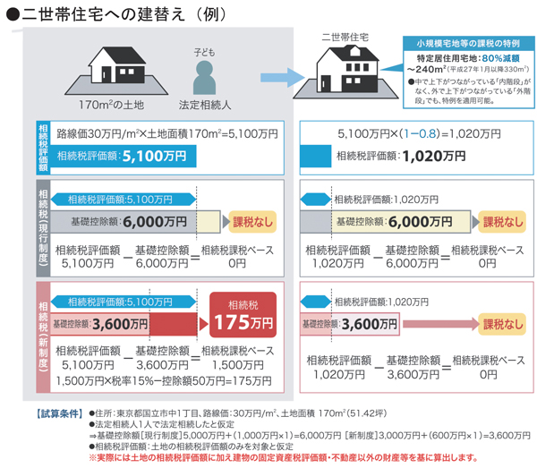 1.開発背景 2013年3月、國(guó)會(huì)で「平成25年度稅制改正関連法案」が可決され、相続稅の基礎(chǔ)控除の引下げ及び稅率構(gòu)造の見直し等により、現(xiàn)行の相続稅の基礎(chǔ)控除額である「5,000萬円+(1,000萬円×法定相続人の數(shù))」から、2015年1月以降は「3,000萬円+(600萬円×法定相続人の數(shù))」に引下げられることになりました。そのため、相続稅課稅対象者數(shù)は稅制改正前と比較すると1.5倍(立田博久稅理士事務(wù)所調(diào)べ)になると予想されます。 一方、同法案で改正された「小規(guī)模宅地等の課稅の特例(※3)」では、特定居住用宅地(※4)においては相続稅評(píng)価額の8割が減額され、限度面積も240㎡から330㎡へと増加する(※5)など、二世帯住宅を建設(shè)されるお客さまにとっての優(yōu)遇策が拡充されます。 そこで、當(dāng)社は路線価が高い都市部での二世帯住宅を検討されているお客さまをメインターゲットに據(jù)えた3階建木造戸建住宅商品?xevo GranWood 都市暮らし」を発売することとなりました。 ※3.個(gè)人が相続した財(cái)産のうち、相続される宅地の相続稅評(píng)価額を軽減できる特例。 ※4.二世帯住宅や賃貸併用住宅など。 ※5.2015年1月1日より開始。