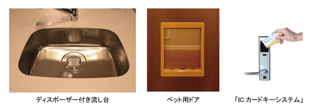 ■設備?防犯 設備面では、全戸に床暖房や生ごみなどを手軽に処理できるディスポーザー付き流し臺、浴室換気乾燥機、エアコン(全室)、インターネット(全室)を完備しました。また、ペット可能住戸にはペットがスムーズに出入りできる専用の室內ドアを設けました。 防犯面では、監視カメラをマンション共用部や駐車場、駐輪場等に約60臺設置。共用部の出入口と各棟のメインエントランスの玄関と各戸の玄関錠にはクレジット機能付きの「ICカードキーシステム」を採用し、防犯性を高めました。