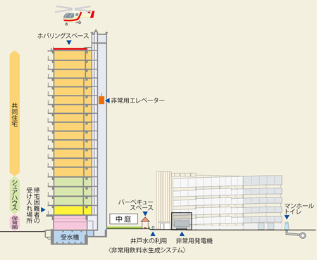 3.災害時に緊急災害対応が可能な大型複合賃貸マンション 「ロイヤルパークスERささしま」は、萬が一の災害時のために、ER(エマージェンシー?レスポンス)(※4)を優先させた賃貸マンションです。 屋上にはヘリコプターのホバリングスペースを設け、傷病者の搬送や、醫者?看護師、物資の受け入れができるようにしました。 また、停電時に利用可能な非常用エレベーターや、帰宅困難者の受入れ場所や傷病者の手當て場所等も確保しました。 あわせて、災害によりライフラインが一時的に斷たれた場合に備えて、災害用マンホールトイレやカセットガス発電機、防災備品や醫薬品を備蓄する倉庫を用意しました。加えて、非常用飲料水生成システムを導入し、一時的に飲用可能な水を提供します。 ※4.都市災害時に近隣住民の災害対策本部の役割を持ったマンション