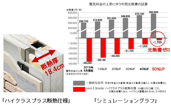 2.電力価格が50%上昇しても光熱費の収支ゼロが可能となる環境性能 「xevo Σ」では、地域やお客さまの要望に合わせて「スタンダード」、「ハイクラス」、そして北海道地域での設定となる「エクストラ」の3つの斷熱仕様を設定していますが、今回新たに、開放的なプランと斷熱性能のバランスをより柔軟に設定できるよう「ハイクラスプラス斷熱仕様」を追加しました。 これにより、政府が2020年に標準的な新築住宅で実現を目指す「ZEH(ネット?ゼロ?エネルギー?ハウス)(※5)」に対応しながら、大空間?大開口を活かしたプラン提案が可能となりました。 「ハイクラス斷熱仕様」を超える高い斷熱性能である「ハイクラスプラス斷熱仕様」は、外壁の斷熱材の厚みを「スタンダード斷熱仕様」の13.2cmから、5.2cm増やした18.4cmとすることで、外皮平均熱貫流率UA値(※6)を向上させ、平成25年省エネ基準による3地域(主に巖手県、青森県、秋田県(※7))におけるUA値の基準値0.56を上回る性能を持ちます。(※8) また、太陽光発電システムと家庭用リチウムイオン蓄電池(6.2kWh)を組み合わせたハイブリッドシステム(※9)や、當社オリジナルのHEMS(ホーム?エネルギー?マネジメント?システム)(※10)「D-HEMS 3(ディー?ヘムス?スリー)」を組み合わせることで、將來電力価格が50%上昇した場合でも光熱費の収支をゼロにできる省エネ性能を実現しました。(※11、12) ※5. 一次エネルギー消費が差し引きゼロとなる住宅。 ※6. 住宅の斷熱性能を表す指標で、數値が小さいほど性能が高いことを示す。 ※7. 実際の地域區分は市町村単位で定められています。 ※8. 5、6地域(一部地域を除く、北関東~九州地方)における標準モデルプラン(136.23㎡)による試算。 ※9. 太陽光発電システムと蓄電池のパワーコンディショナーを一體化し、平常時も停電時も電力を安定供給するシステム。ハイブリッドパワーコンディショナーとリチウムイオン蓄電池ユニットはエリーパワー株式會社製。 ※10.情報通信技術の活用により、人に代わって住宅のエネルギー管理などを支援するシステムのこと。 ※11.數値は獨自のシミュレーションツール「ecoナビゲーター」の試算による?!窘ㄔO地】東京都【延床面積】136.23㎡(「xevo Σ」標準モデルプラン、ハイクラスプラス斷熱仕様)【ご家族】4人家族【太陽光発電システム】5.5kWを搭載【売電単価】固定価格買取制度による太陽光発電システムの売電単価は33円/kWh(稅込)【料金単価】東京電力、東京ガスの2014年4月の料金體系(消費稅率8%) ※12.鉄骨系工業化住宅においてNo.1の省エネ性能。